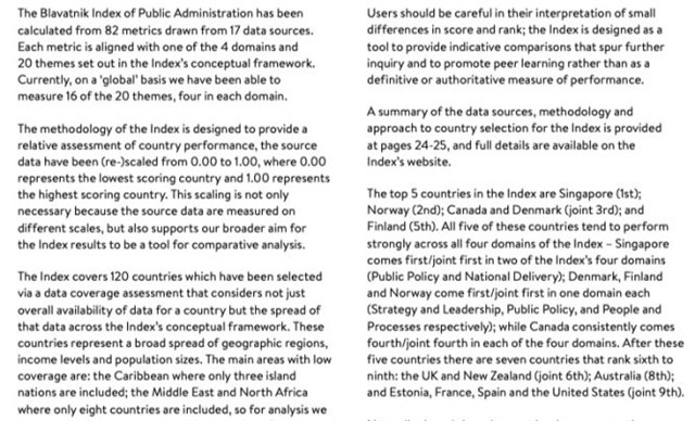 英國(guó)牛津大學(xué)的布拉瓦尼克政府學(xué)院于2024年12月5日公布了最新布拉瓦尼克公共行政指數(shù)報(bào)告(Blavatnik Index of Public Administration),比較了全球120個(gè)國(guó)家的公共管理部門(mén)。新加坡民事服務(wù)全球居冠。新加坡在邊境服務(wù)、稅務(wù)管理創(chuàng)新策略和實(shí)踐方面領(lǐng)先全球其他國(guó)家。