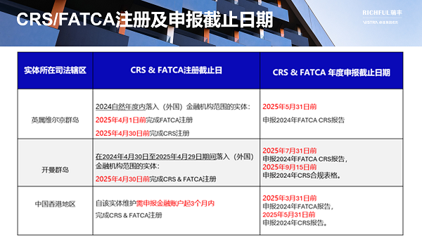 如果您仍然不確定實體是否落入CRS/FATCA范圍,或者需要我們協(xié)助注冊/申報等合規(guī)事宜,請盡快聯(lián)系為您提供專屬服務(wù)的RICHFUL瑞豐客戶經(jīng)理,以尋求支持,我們將竭誠為您服務(wù)。