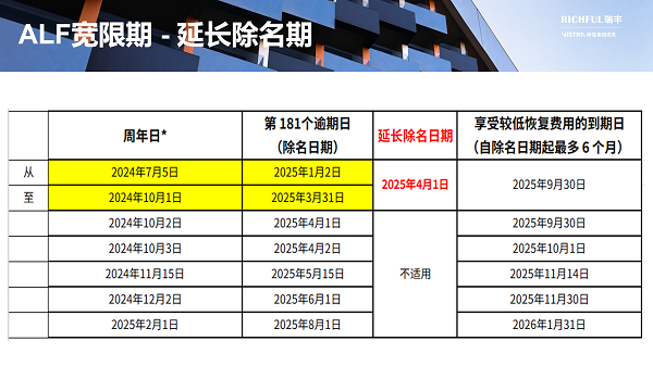 *如果周年日期是周末或公共假期,F(xiàn)SA將在隨后的下一個(gè)工作日接受 ALF 申請(qǐng),不會(huì)受到任何處罰,但這不會(huì)改變除名日期的計(jì)算或較低的恢復(fù)費(fèi)用期限。