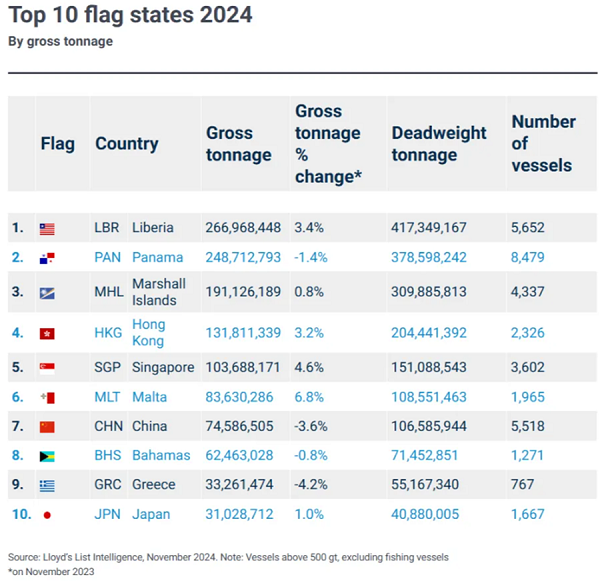 據(jù)勞氏船級(jí)社數(shù)據(jù)顯示,2024年十大船旗國(guó)排名中,前五名分別為利比里亞、巴拿馬、馬紹爾、香港和新加坡,馬耳他,其中利比里亞、巴拿馬、馬紹爾都是國(guó)際運(yùn)輸業(yè)工人聯(lián)合會(huì)(ITF)認(rèn)定的方便旗國(guó)家,而新加坡和香港也接受外國(guó)公司注冊(cè)船籍。
