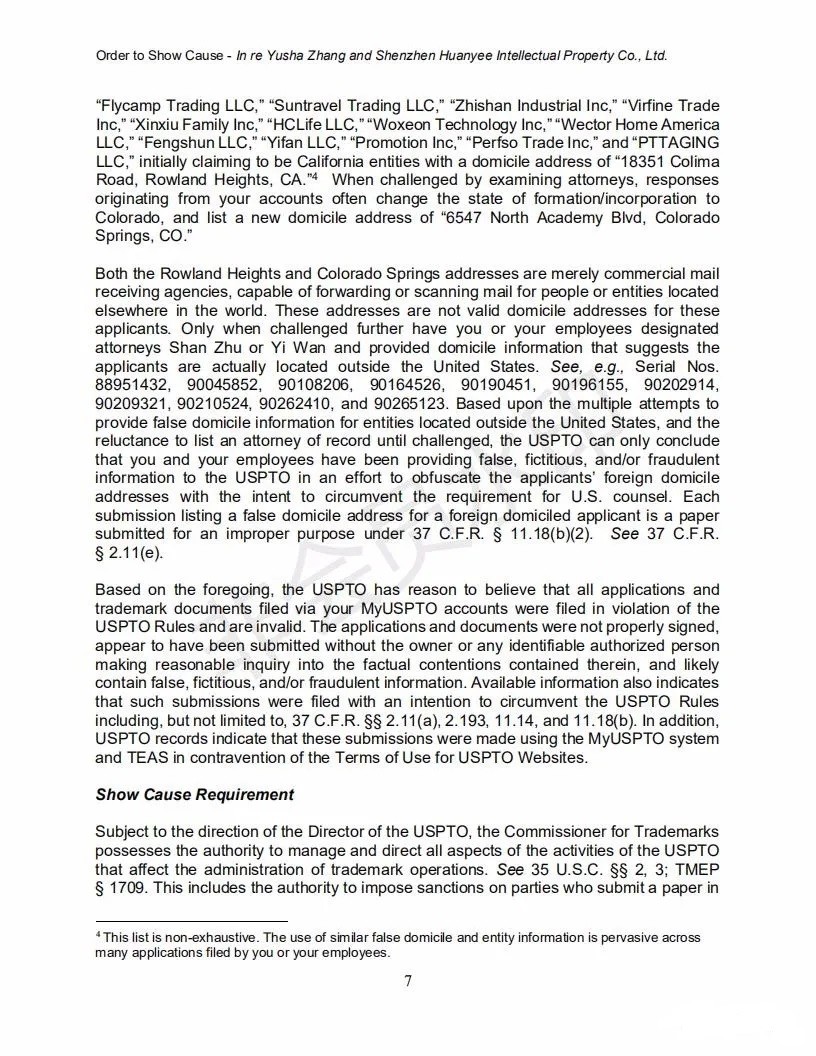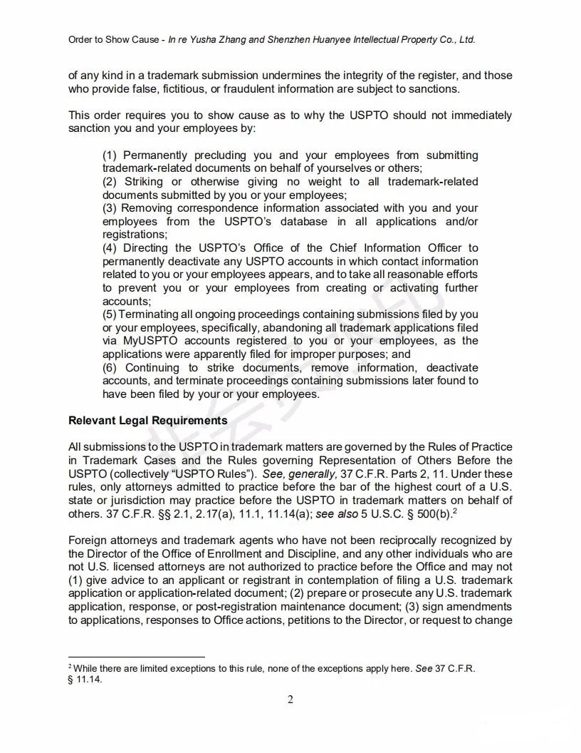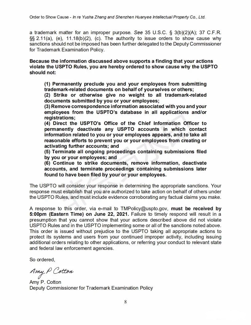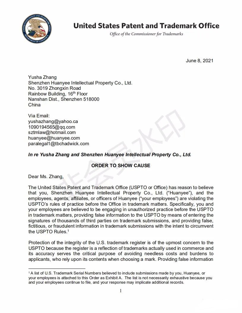 2021年6月8日,美國專利商標(biāo)局(USPTO)向中國深圳一家知識產(chǎn)權(quán)公司的代表人發(fā)出一份123頁的“ORDER TO SHOW CAUSE”。對該公司代理提交的批量美國商標(biāo)的行為,尤其是其中涉及到第三方簽名提供虛假、虛構(gòu)和欺詐信息的行為提出質(zhì)疑,要求該公司提出合理的理由,并在美國東部時間6月22日下午5:00前進(jìn)行回復(fù)。否則USPTO將會對該代理機(jī)構(gòu)以及代表人進(jìn)行制裁。