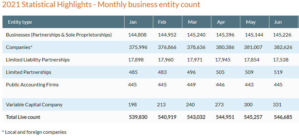 根據(jù)新加坡會(huì)計(jì)與企業(yè)管理局(ACRA) 于2021年7月1日發(fā)布的統(tǒng)計(jì)數(shù)據(jù),新加坡上半年的新設(shè)公司總數(shù)為33,349家。得益于全球經(jīng)濟(jì)復(fù)蘇,新加坡的新設(shè)公司同樣有所回暖,但是無論是現(xiàn)有公司數(shù)量、上半年新增公司數(shù)量,還是6月新增公司數(shù)量,其與香港公司的表現(xiàn)都仍有一定差距。