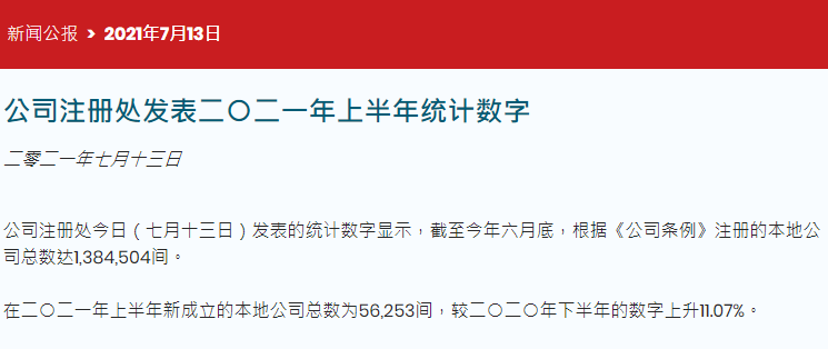7月13日,香港公司注冊(cè)處發(fā)表2021年上半年統(tǒng)計(jì)數(shù)字,統(tǒng)計(jì)數(shù)字顯示,截至今年六月底,根據(jù)《公司條例》注冊(cè)的本地公司總數(shù)達(dá)1,384,504間。在2021年上半年新成立的本地公司總數(shù)為56,253間,較2020年下半年的數(shù)字上升11.07%。