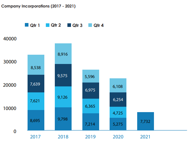 從統(tǒng)計(jì)數(shù)據(jù)看,BVI公司在2021 年第一季度設(shè)立公司7,732家,較2020年下半年的數(shù)字上升26.59%。截至3月31日,在BVI設(shè)立的公司總數(shù)達(dá)到了372,196家。